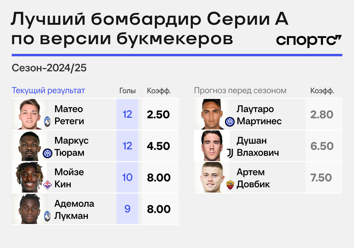 В Италии главным фаворитом котировался лучший бомбардир Серии А прошлого сезона и Кубка Америки-2024 – Лаутаро Мартинес. После 14 матчей у него лишь 5 голов, поэтому его уже нет и в топ-5 фаворитов.