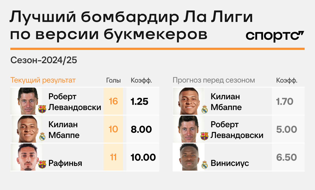 Килиан Мбаппе ворвался в Ла Лигу как главный фаворит гонки бомбардиров. Правда, вскоре мирно отдал это место Роберту Левандовскому. Форвард «Барселоны» с 16 голами уверенно лидирует в рейтинге голеадоров. Шансы 36-летнего поляка на «Золотую бутсу» взлетели с 20% до 80%.