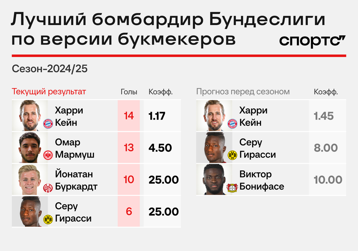 Однако букмекеры не сомневаются, что Мармуш, неожиданно ворвавшийся в гонку, вскоре выпадет из борьбы, а Кейн станет лучшим бомбардиром Бундеслиги второй сезон подряд.