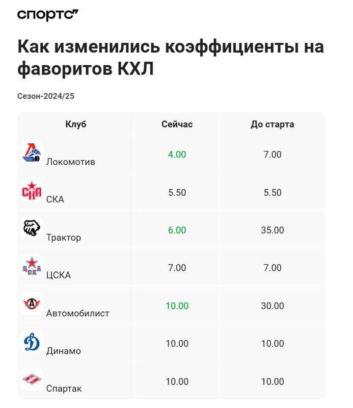 Заметный прогресс по кэфам у «Автомобилиста» – с 30.00 до 10.00. Хотя перед регуляркой были опасения, как екатеринбуржцы выступят после лучшего сезона в истории клуба. Однако «Автомобилист» не проваливается и пока разбивает предстартовые прогнозы букмекеров.