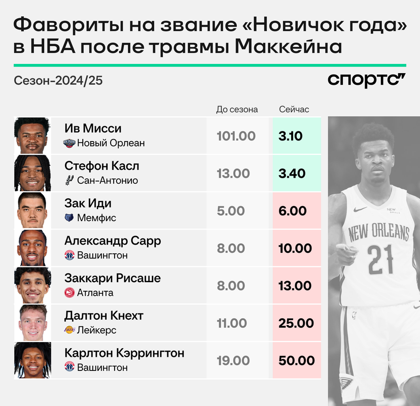 Остальные в линии на «Новичка года» только подорожали со старта регулярки. Например, Зак Иди из «Мемфиса», который пропустил месяц из-за травмы голеностопа. До сезона 224-сантиметровый центровой котировался главным фаворитом за 5.00. Теперь же Иди оценивается в 6.00 и идет третьим после Мисси и Касла.