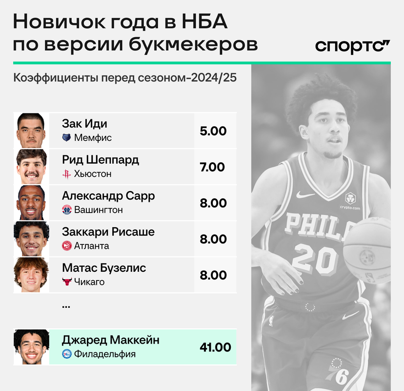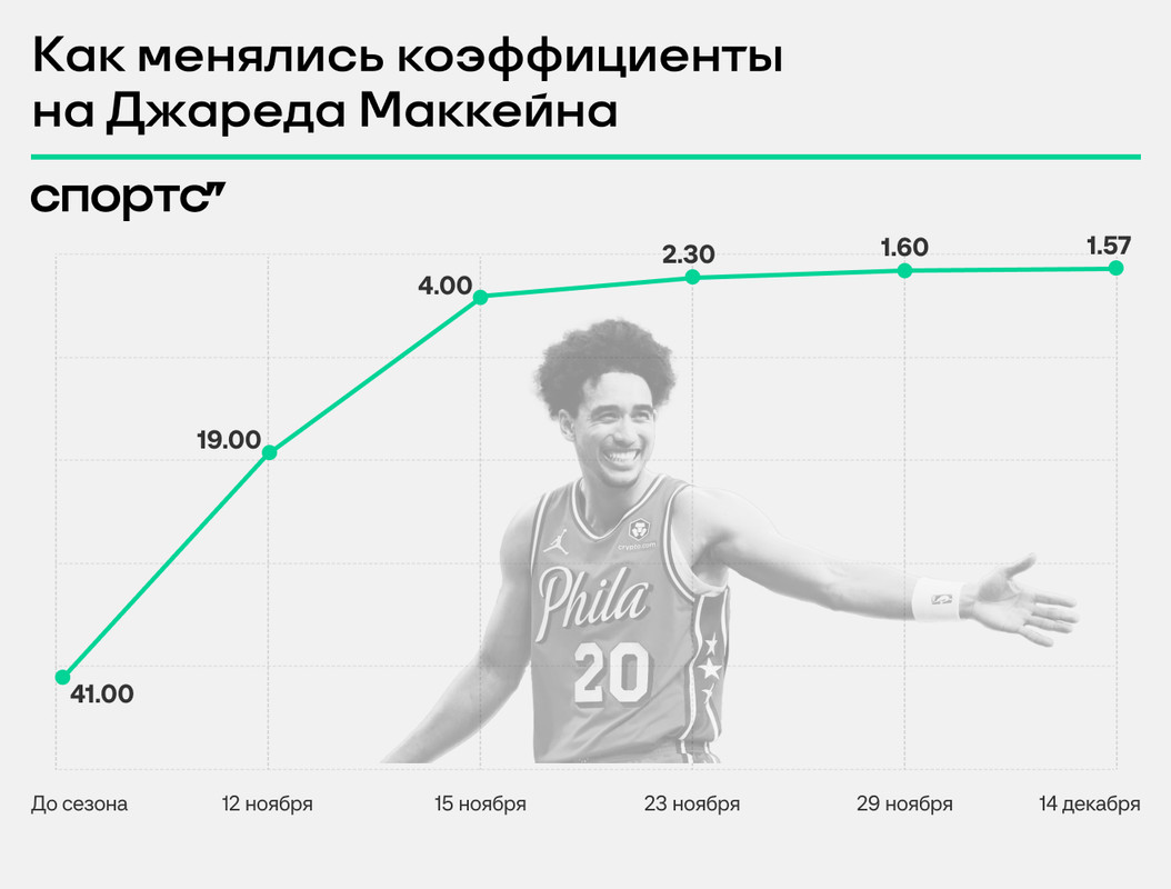Примечательно, что перед сезоном его и близко не было в топ-10 фаворитов на награду. На защитника «Филадельфии» давали 41.00. Цифры начали ползти вниз почти сразу, а спустя месяц регулярки Маккейна оценивали уже в 2.30. Кэф обрушился в 18 раз!