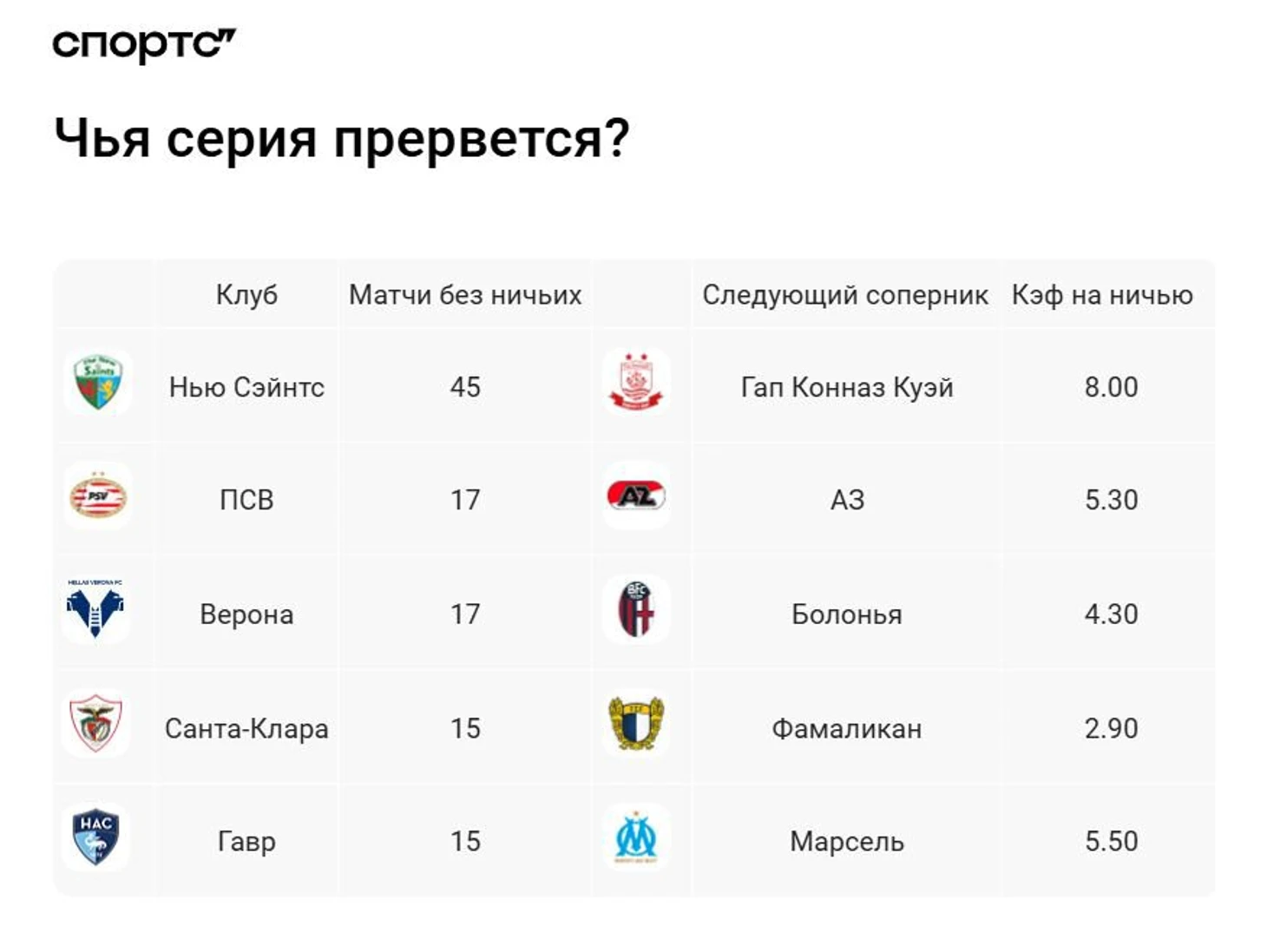 Португальский середняк – настоящая аномалия. Во-первых, клуб, вернувшийся в элиту, сейчас располагается на пятом месте в турнирной таблице и претендует на еврокубки – это очевидный сюрприз. Во-вторых, «Санта-Клара» по статистике как раз соответствует ценителям ничьих, но на деле – бескомпромиссная серия в лиге.