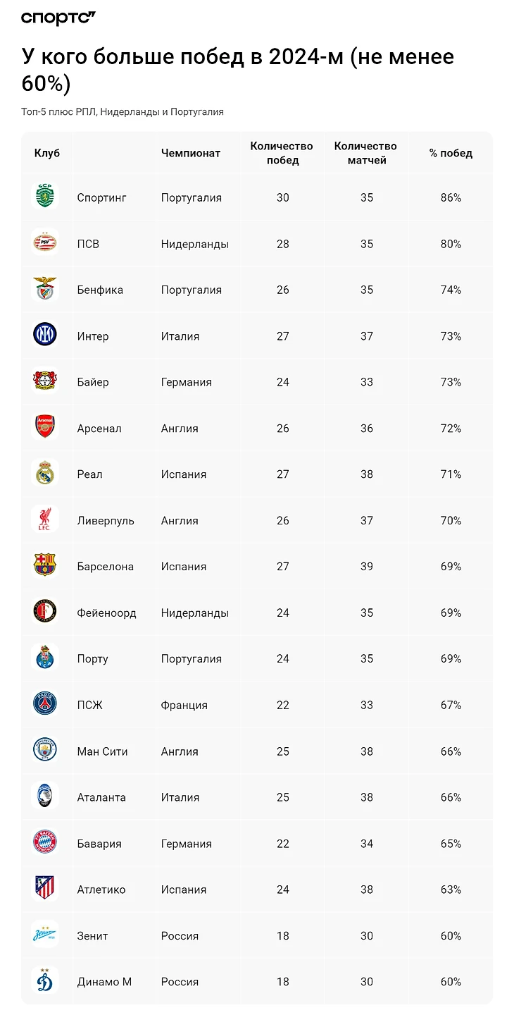 «Арсенал» и «Ливерпуль» – лучшие в АПЛ, «Сити» тоже успел вклиниться. Топ-тройка в Ла Лиге и два сильнейших клуба Бундеслиги – также в списке. В Италии немного не добрался «Лацио» с 55%, а во Франции совсем чуть-чуть не хватило «Лиону», который выиграл 19 из 32 матчей – у него 59%.