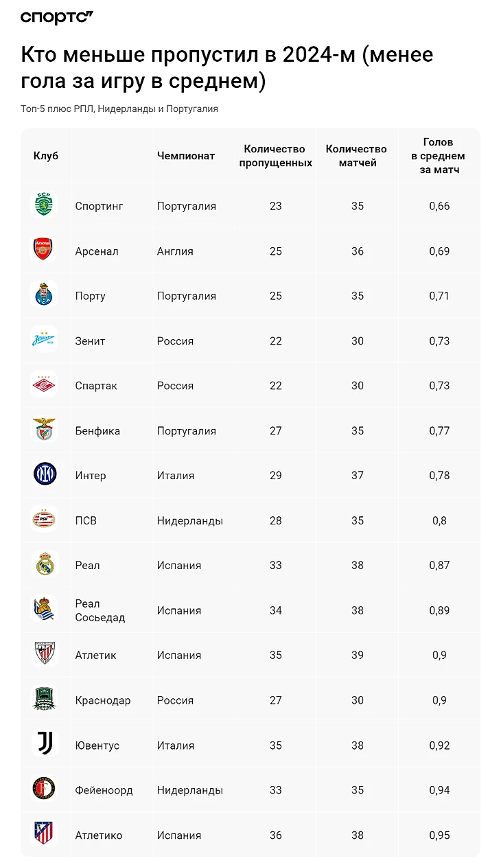 Пропущенные за 2024-й: «Арсенал» почти первый – и единственный из АПЛ, здесь есть три российских клуба