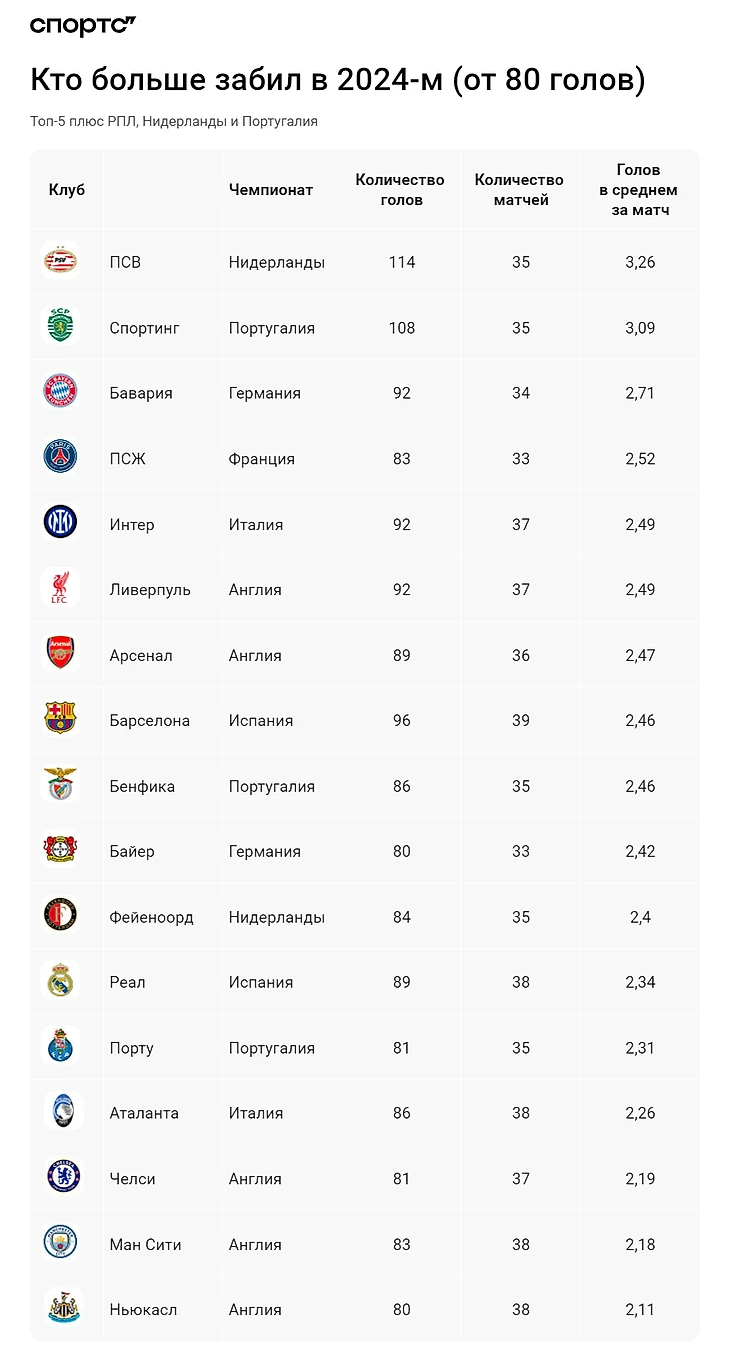 Российских команд тут нет, поскольку даже самая голевая («Динамо») и до 80 не добила, и по среднему количеству не пройдет (2,03 за игру).