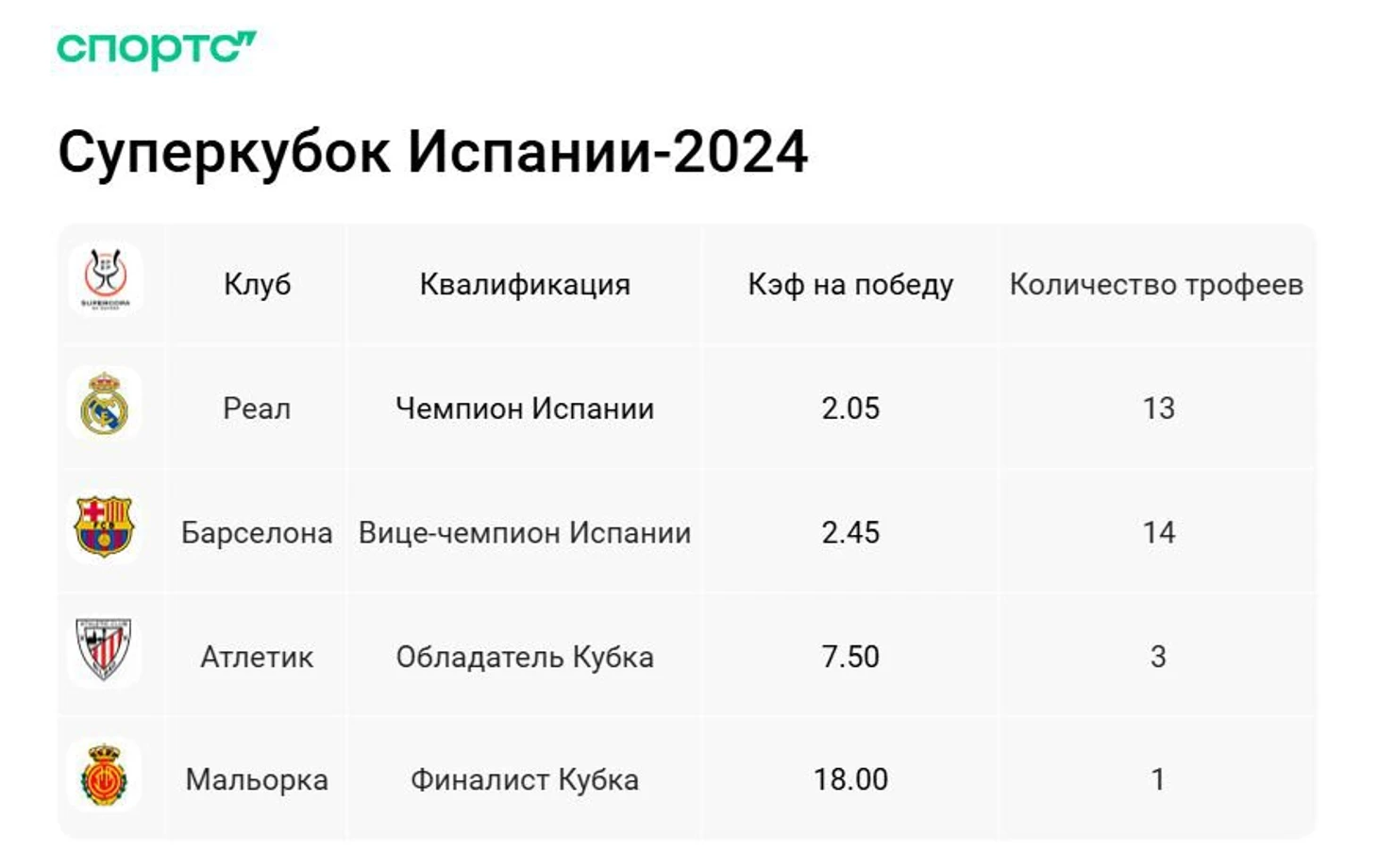 В Суперкубке точно не сыграют травмированные Андреас Кристенсен, Марк Берналь и Марк-Андре тер Штеген. Ламин Ямаль только вернулся в общую группу. А вот для Дани Ольмо и Пау Виктора предстоит придумать новую категорию – к дисквалифицированным их точно не отнести. Скандальная история с фактической потерей двух футболистов – еще один негативный фактор по коэффициентам.
