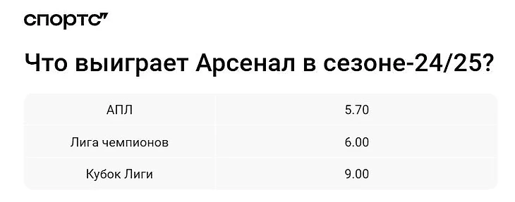 Таким образом, примерная вероятность того, что «Арсенал» выиграет хоть что-то в 2025 году составляет около 30%, исходя из линии букмекеров.