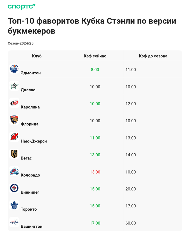 По ходу регулярки букмекеры долго не выделяли конкретный клуб, а также никому не позволяли преодолеть отметку в 10.00. И лишь недавно «Эдмонтон» стал единоличным фаворитом, да еще и с кэфом 8.00. Феномен для текущего сезона.