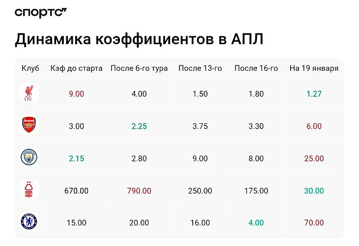 Ужасающая динамика по итоговым коэффициентам для команды Артеты. После ничьей с «Астон Виллой» средняя котировка на главного преследователя «Ливерпуля» – 6.00.