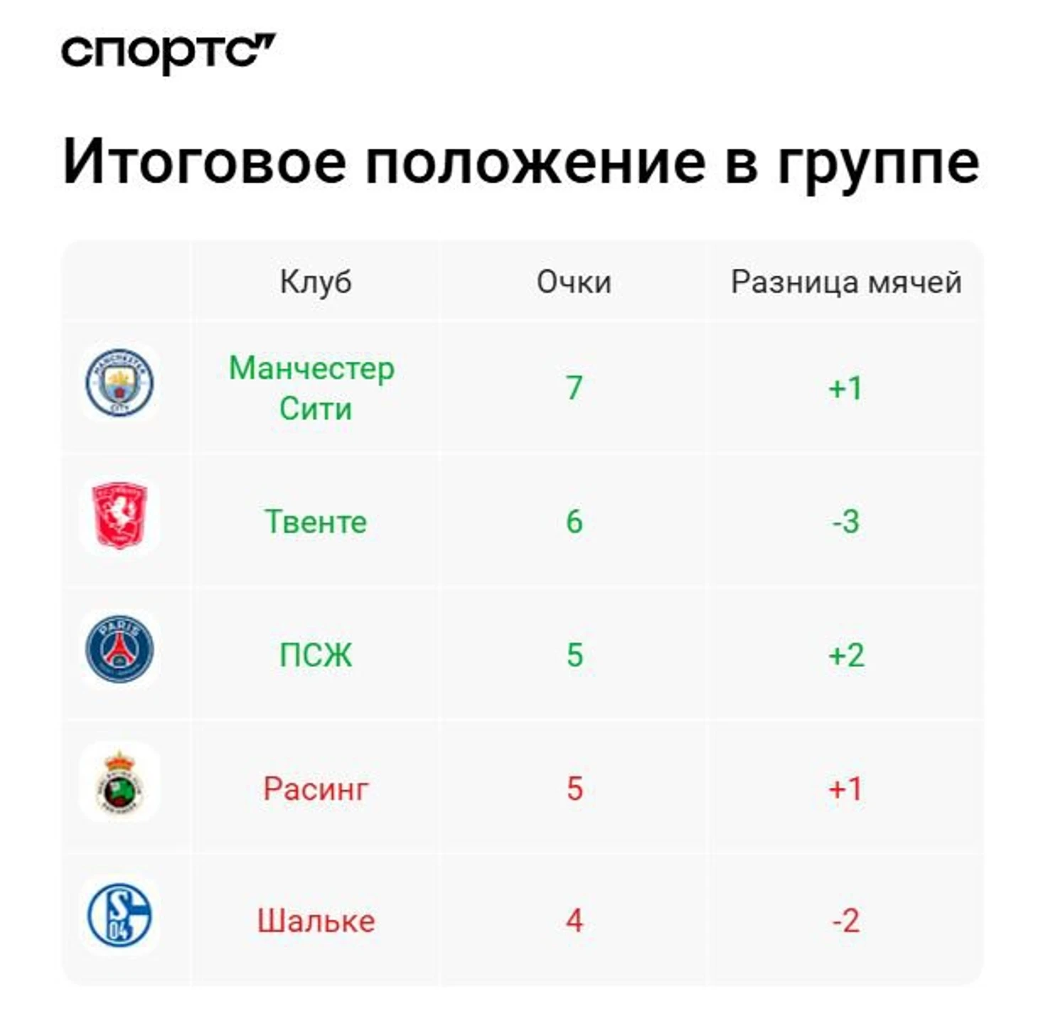 «Манчестер Сити» в итоге помог «ПСЖ». В заключительном туре англичане смогли не проиграть «Расингу» с крупным счетом, а парижане забили четыре гола немотивированному «Твенте». Французы так и проскочили в плей-офф.