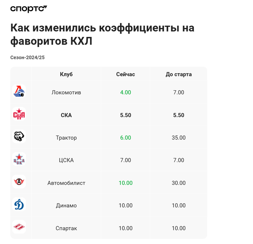 Самый заметный прогресс по кэфам у «Трактора». Челябинцы лидируют на Востоке, а кэф на них рухнул с 35.00 до 6.00. Могут повторить или даже превзойти результат прошлого сезона.