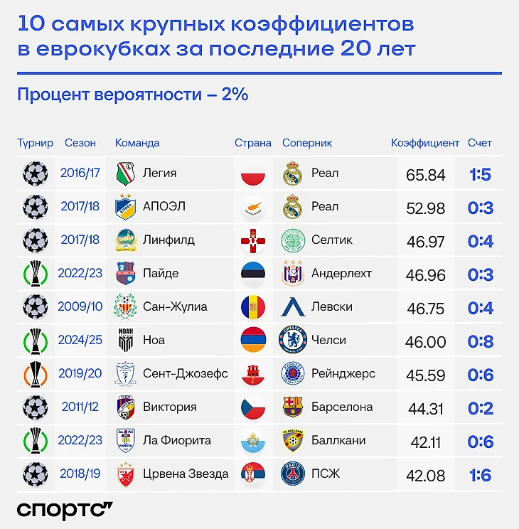 ● Рекорд ли это для матча ЛЧ? Фактически – да, как и еврокубков в целом. Вот таблица с крупнейшими коэффициентами за последние 20 лет. В ней еще один матч этого сезона – «Челси» против «Ноа», про которую мы писали.