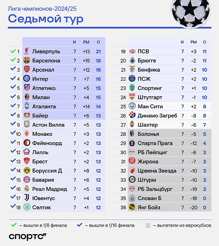 Чтобы попасть в топ-8, «Баварии» надо опередить семь команд, которые сейчас располагаются выше. Теоретически может сложиться так, что победа хоть в сотню мячей над «Слованом» все равно поднимет мюнхенцев максимум на 13-е место: ниже точно окажется кто-то из пары «Лилль» – «Фейеноорд», по разнице хуже будет «Боруссия», а все остальные конкуренты выиграют свои матчи.