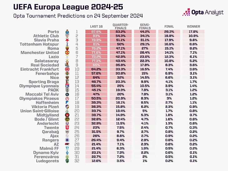 Необъяснимый сюжет: расхождение между ожиданием и реальностью для «Славии». В сентябре анализ Opta очень сильно удивил: чешскую команду поставили выше «Манчестер Юнайтед» и «Тоттенхэма». «Славия» получила почти 10% на выигрыш еврокубка.