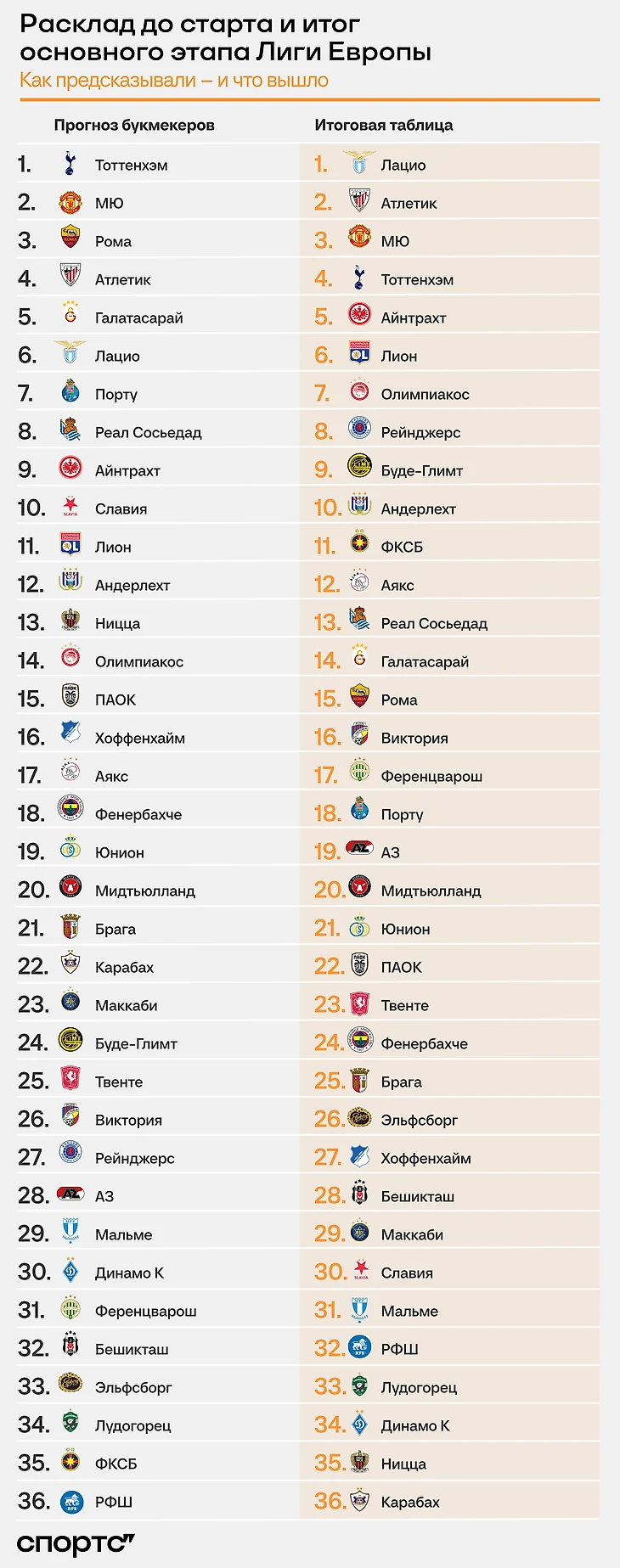 Расклад на победителя Лиги Европы: «Манчестер Юнайтед» обошел «Тоттенхэм», «Лацио» ворвался в топ-5