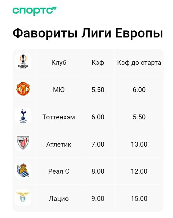 «Манчестер Юнайтед» сменил «Тоттенхэм» на первой позиции. Здесь на коэффициентах больше отразился именно кризис «шпор», чем успехи команды Рубена Аморима. Тройку фаворитов с небольшим отставанием завершает «Атлетик». Не забываем: финал Лиги Европы пройдет в Бильбао – важнейший фактор.
