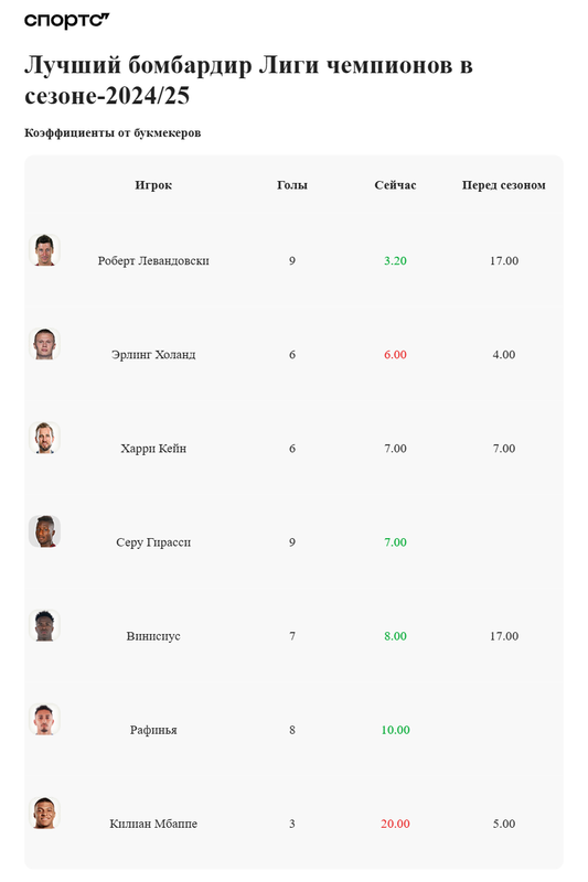 Теперь же главным фаворитом на победу в гонке считается Левандовски. Любопытно, что вторым котируется Холанд. Все-таки в стыках «Ман Сити» сыграет с «Реалом» и, учитывая коэффициенты, вряд ли пройдет дальше. На Винисиуса, который все еще мечтает о «Золотом мяче», дают 8.00. Мбаппе, который раззабивался в Ла Лиге, особо не активничает в ЛЧ. В его победу пока не верят – 20.00.