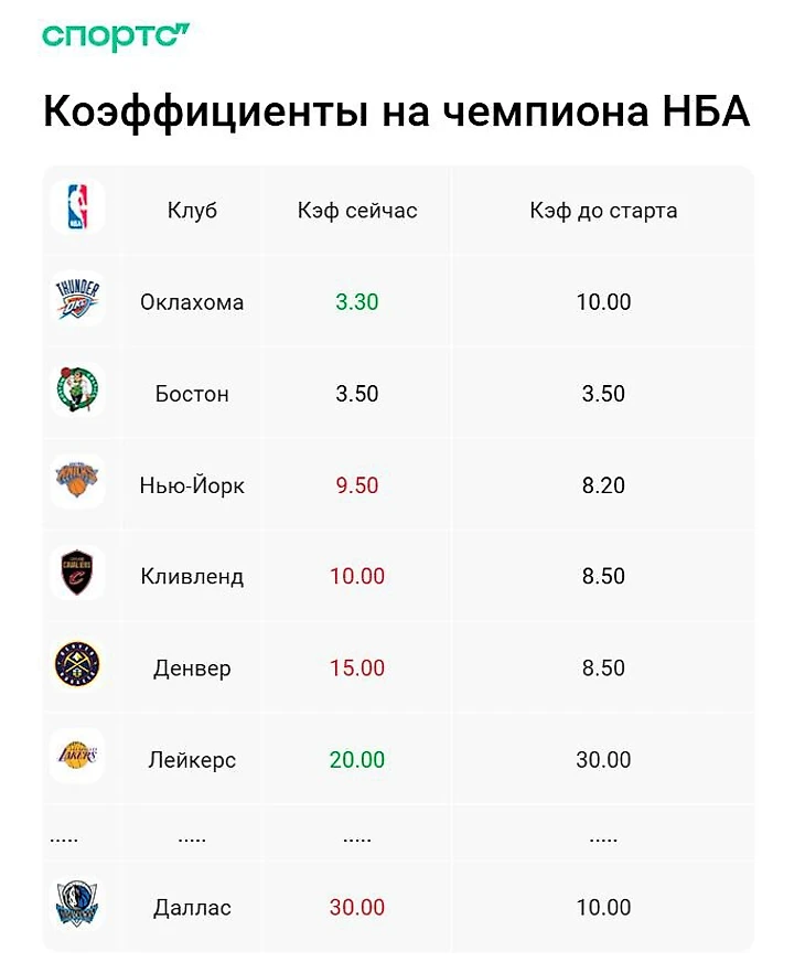 Трансформация коэффициентов на чемпионство «Далласа» – просто график боли для фанатов. До старта финалисты прошлого сезона железно стояли в топ-5. На титул Дончичу и партнерам отводили солидные десять процентов. В то же время большим преимуществом над конкурентами располагал только «Бостон» – остальные шли плотной группой.