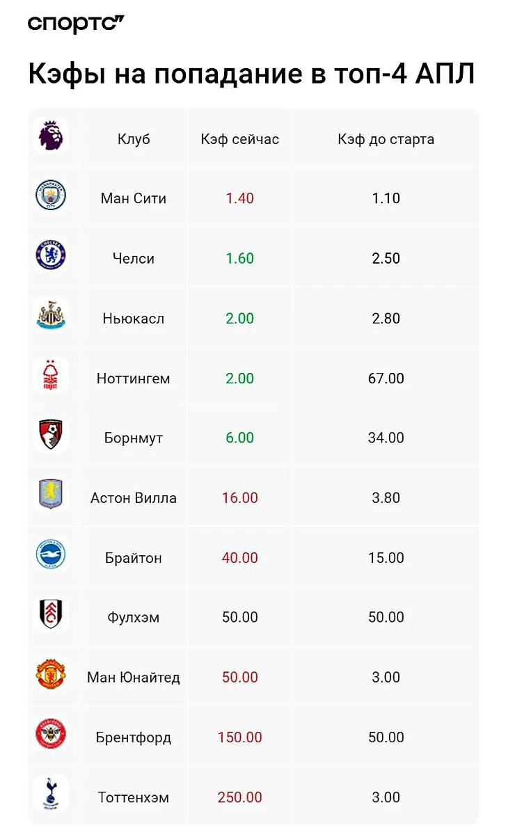 Наряду с «Ноттингемом», безумный прогресс у «Борнмута»: до сезона на топ-4 от парней Андре Ираолы можно было ставить минимум за 30.00 – сейчас 6.00.