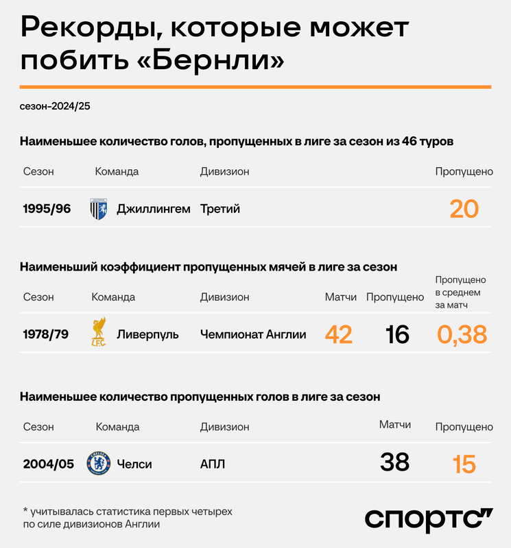 С такой защитой «Бернли» может замахнуться сразу на несколько рекордов Англии. Например, команда, скорее всего, перебьет достижение «Джиллингема» из сезона-1995/96, они удерживают рекорд по пропущенным за сезон в 46 туров.