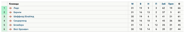 Как раз первые двое выходят в Премьер-лигу напрямую, команды с третьего по шестое места играют плей-офф. Все плотно, по потерянным выше «Шеффилд», но вот от пятой строки уже приличный отрыв.
