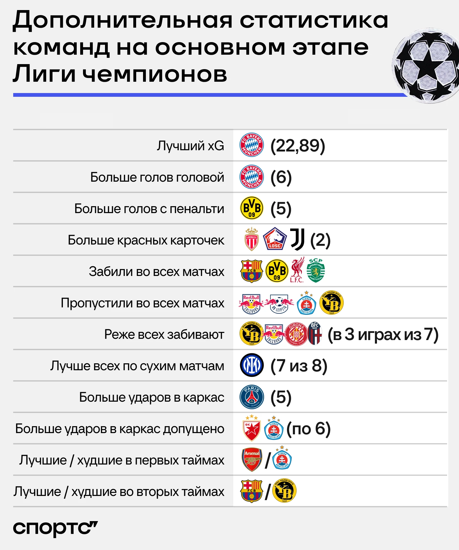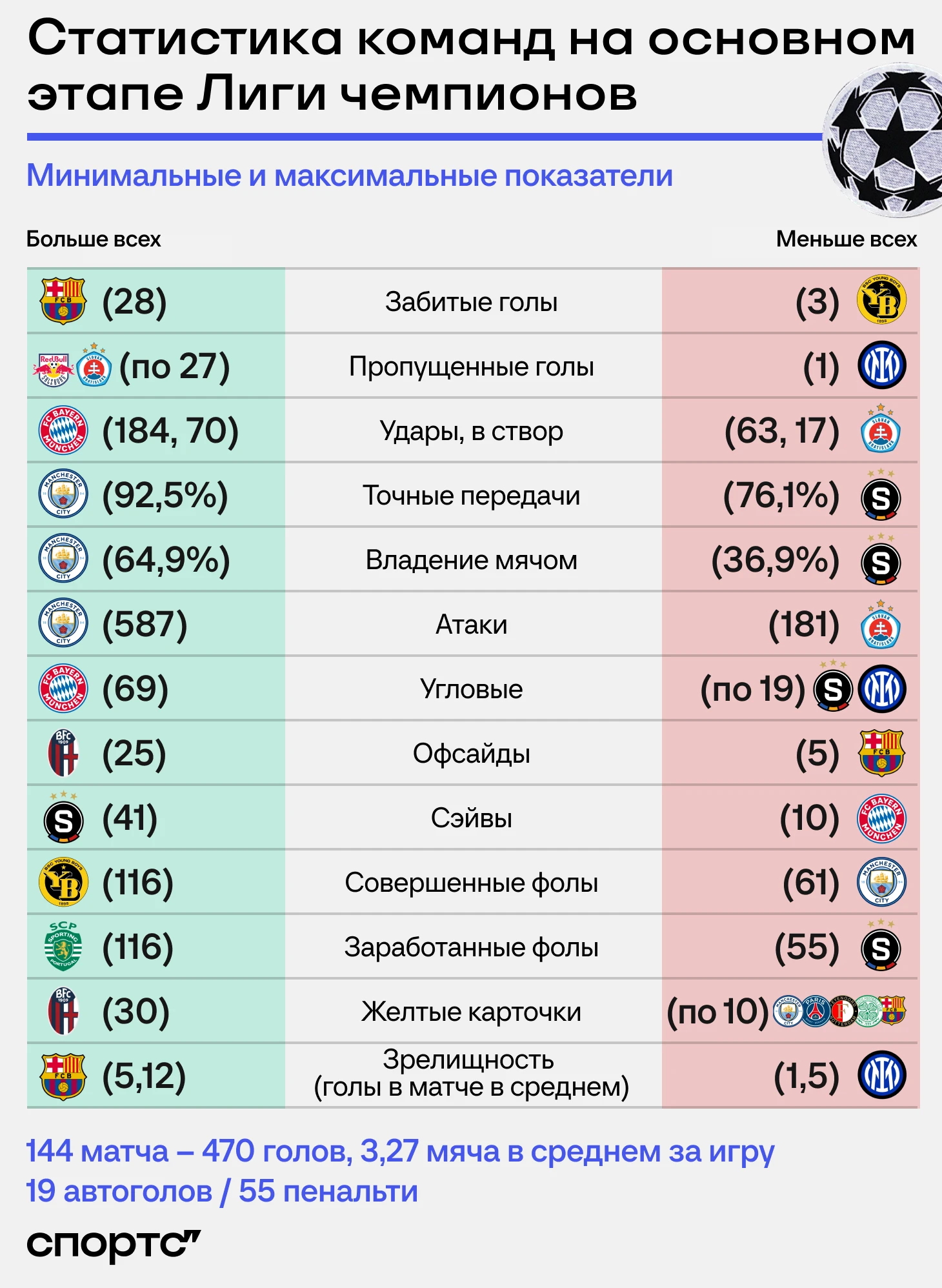 «Барса» – лидер по забитым, на два гола отстала «Боруссия», а реже «Болоньи» забивали только «Янг Бойз». По пропущенным «Интер» – лидер: итальянцы пропускали только однажды (от «Байера»). «Арсенал» позволил забить три гола.