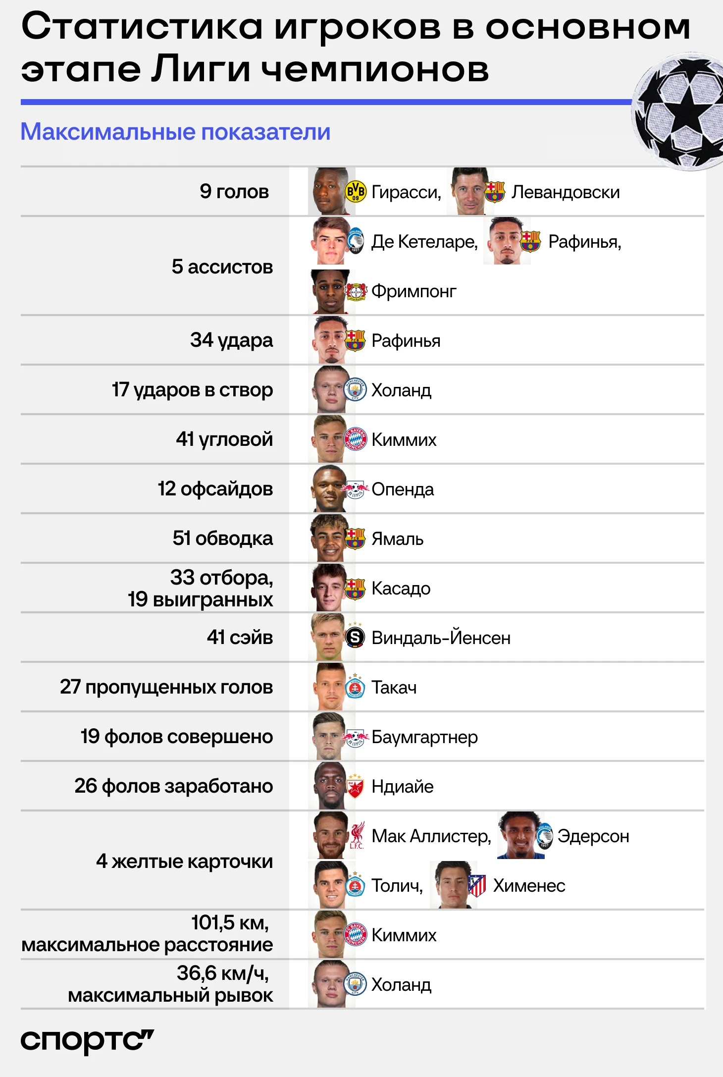 Серу Гирасси и Роберт Левандовски возглавляют список бомбардиров, но у них на двоих семь голов с пенальти. Чаще всех с игры забивает Рафинья – восемь мячей. Рядом еще один представитель Ла Лиги – Винисиус с семью голами.