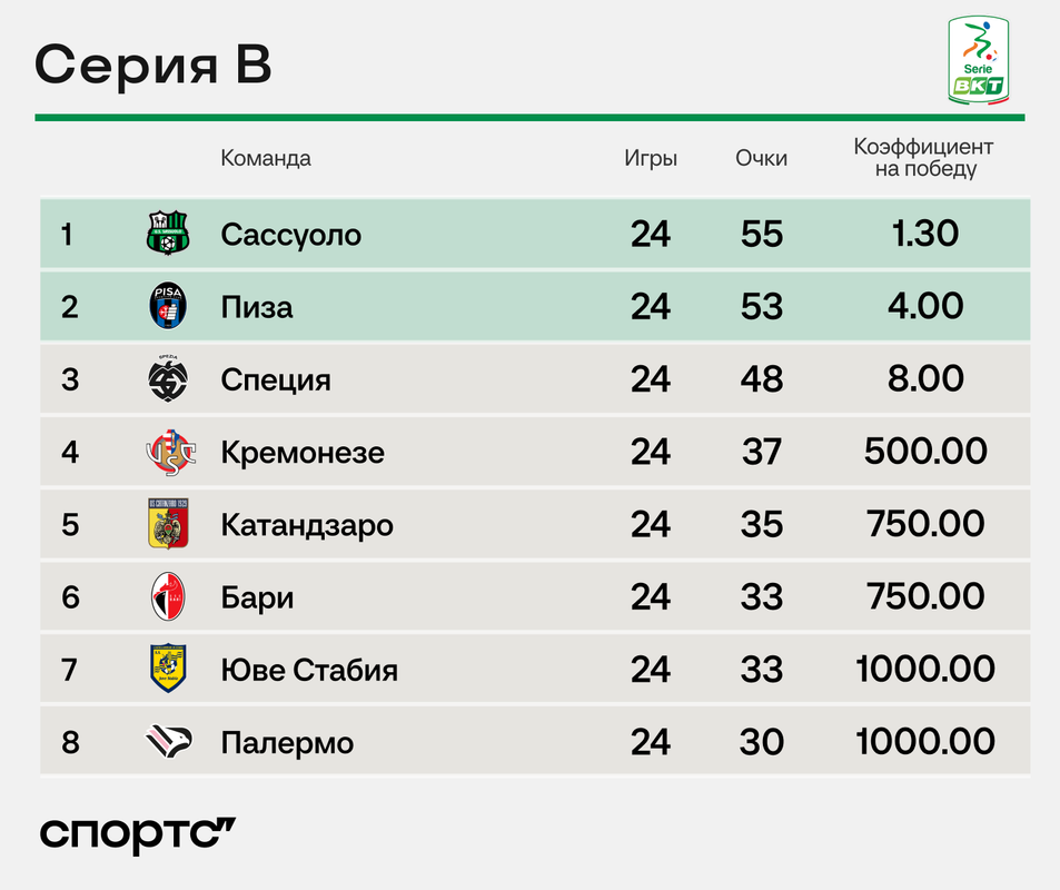 Всего на два очка от «Сассуоло» отстает «Пиза». Букмекеры не надеются в чемпионство, зато верят, что клуб из города с падающей башней спустя 34 года вернется в Серию А.