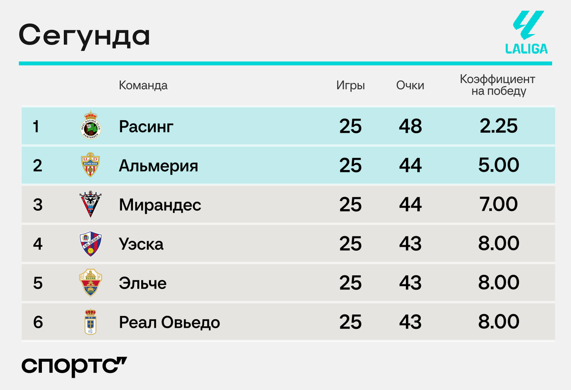 Кто выйдет в Ла Лигу вместе с «Расингом» – вопрос открытый. Плотность на верху таблицы аномальная, дистанция от второго до восьмого места умещается всего в четыре очка. Удивляет присутствие здесь «Мирандеса», который в прошлом сезоне едва избежал вылета в третий дивизион, а лучшим достижением считается восьмое место в Сегунде-2014/15. Теперь же клуб может впервые в истории выйти в Ла Лигу.