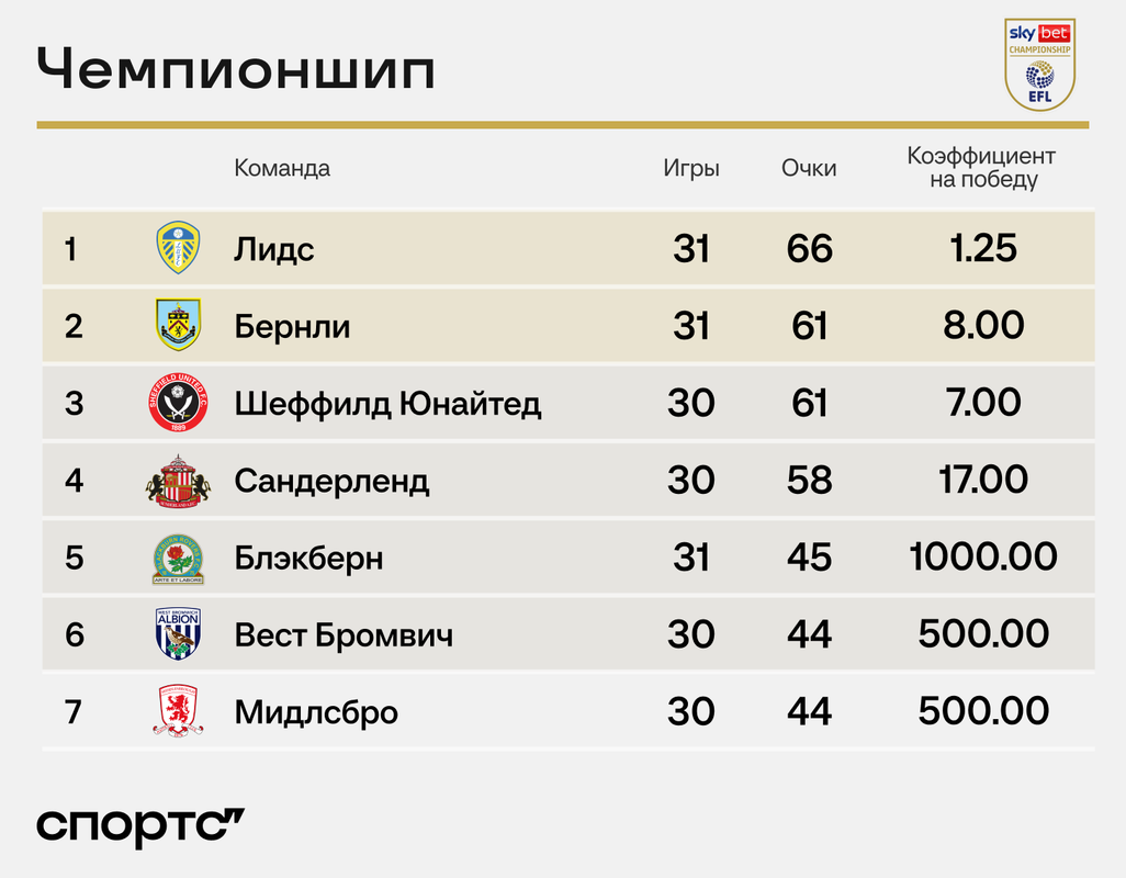 В Чемпионшипе сюрпризов по лидерам нет. Первые две строчки занимают два главных фаворита: «Лидс» и «Бернли». Тут, скорее, любопытен их абсолютно разный футбол. «Лидс» забивает больше всех в Чемпионшипе, а «Бернли» аномально редко пропускает – всего девять голов в 31 матче!