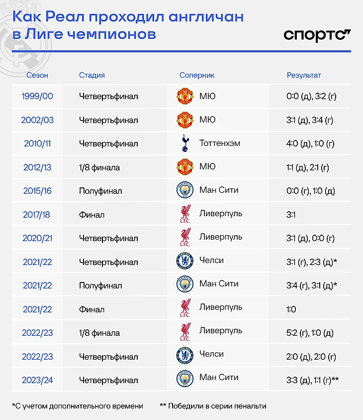 А вот единственный английский топ-клуб без поражений от «Реала» в плей-офф – «Арсенал». Более того, Мадрид даже не забивал. Команда Арсена Венгера выбила испанцев по пути к финалу в сезоне-2005/06, оформив один гол в двух матчах. За двадцать лет соперники больше не встречались, но в нынешнем розыгрыше могут пересечься уже в четвертьфинале.