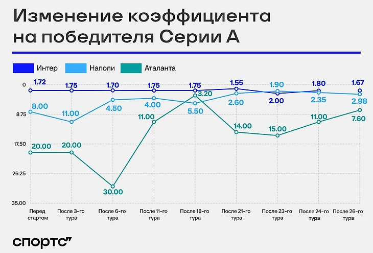 Любопытно, что за весь сезон Серии А главный фаворит менялся лишь раз. Лидеры таблицы и то чаще чередовались. «Наполи» возглавил линию после неожиданного поражения «Интера» от «Фиорентины» в перенесенном матче 14-го тура (0:3). Это случилось 6 февраля.