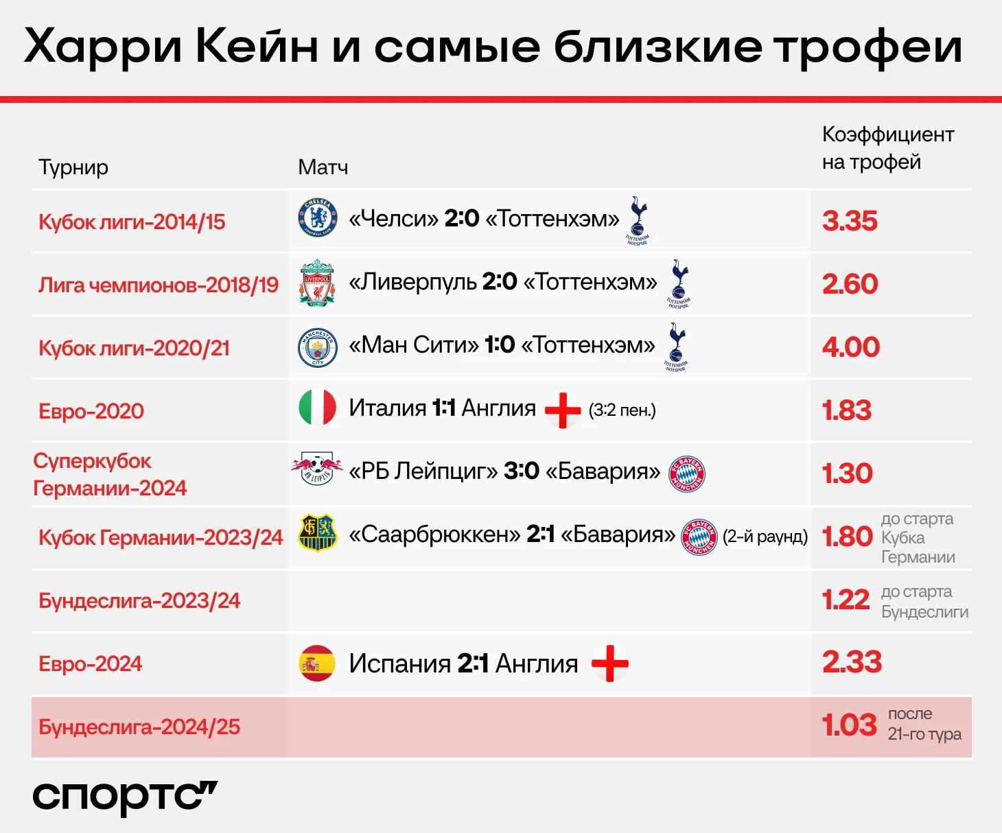Англичанин до «Баварии» ближе всего к трофею подбирался в финале Евро-2020. Тогда сборная шла фаворитом против Италии, коэффициент на титул не поднимался выше 1.85.