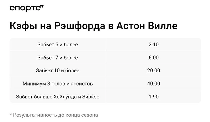 Самый интересный и обидный вариант в линии – сравнение с Расмусом Хейлундом и Джошуа Зиркзе. Аналитики считают, что один Рэшфорд в «Астон Вилле» забьет до конца сезона больше, чем два форварда «МЮ» суммарно. Коэффициент на такое – 1.90. Предпосылки есть: у датчанина лишь два гола за 19 матчей, у нидерландца – на один больше в 24 играх.