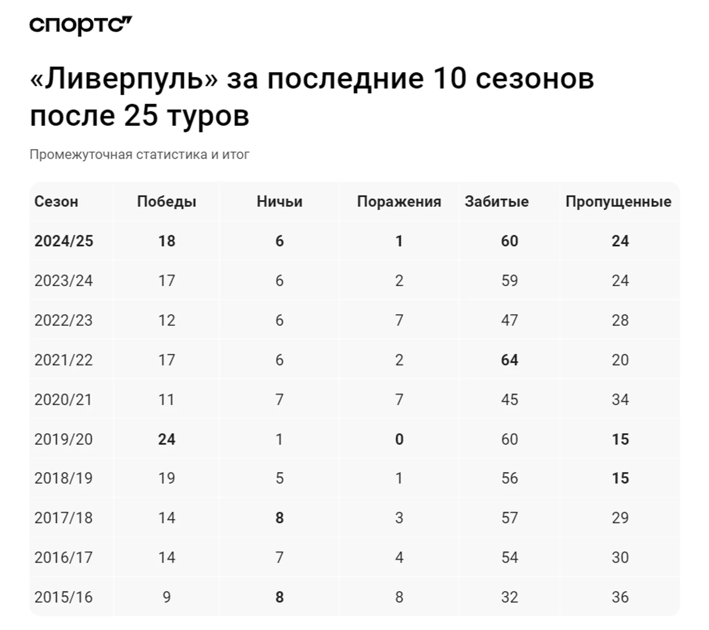 В двух сезонах подряд «Ливерпуль» пропускал так мало к 25-му туру – всего по 15 голов. А худший по мячам период был в первом сезоне Юргена Клоппа – много пропущенных, очень мало забитых и даже отрицательная разница мячей.