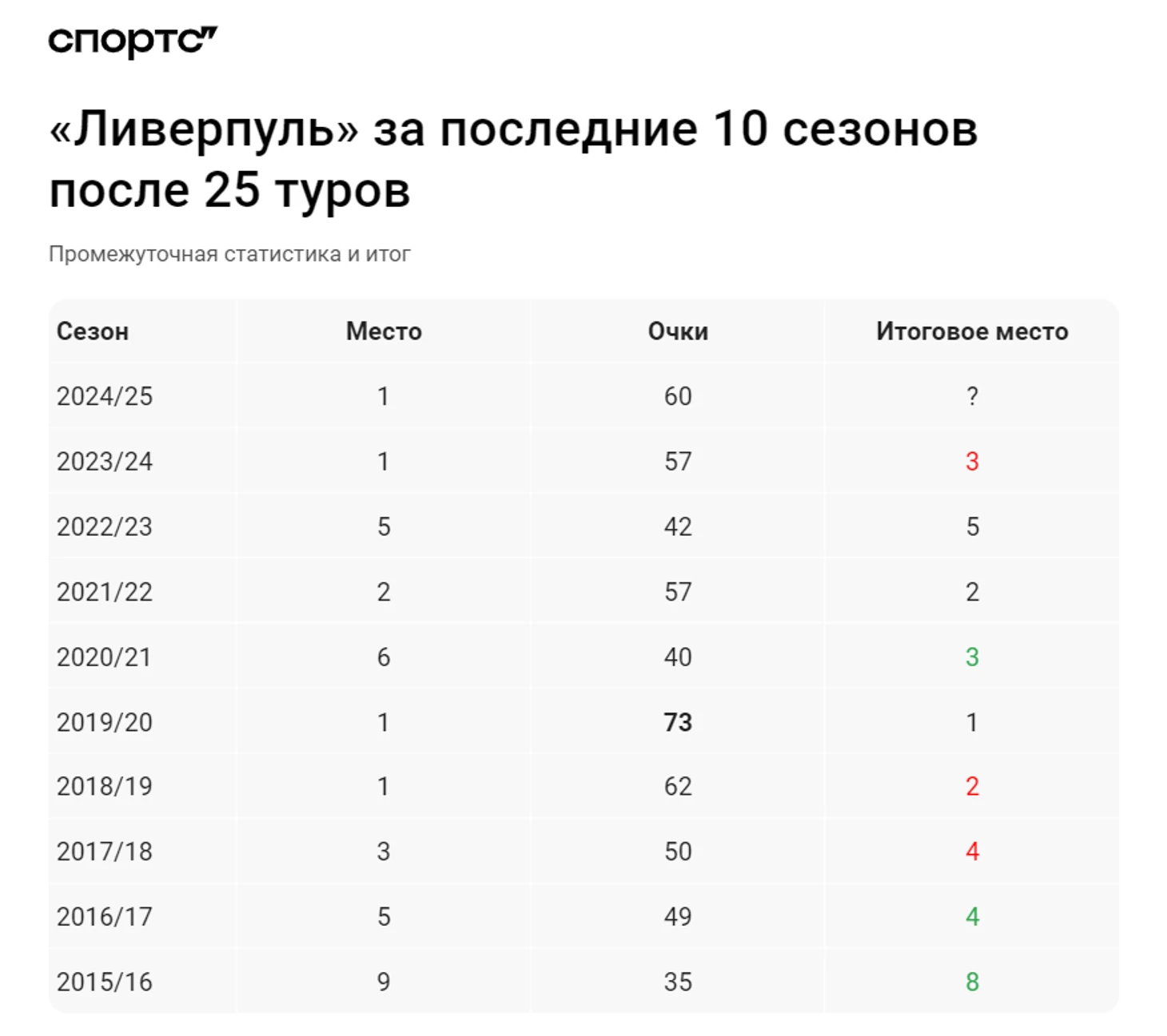 Теперь чуть подробнее рассмотрим результаты «Ливерпуля» за 25 туров в последние десять лет.