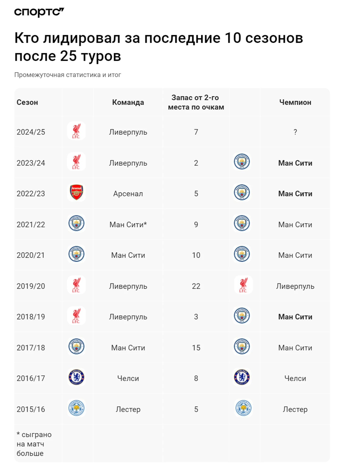 Судя по статистике прошлых лет, лидер после 25 туров нечасто упускал преимущество, хотя дважды таковым был как раз «Ливерпуль», у которого «Ман Сити» перехватывал титул. Еще один раз команда Пепа Гвардиолы опередила «Арсенал».