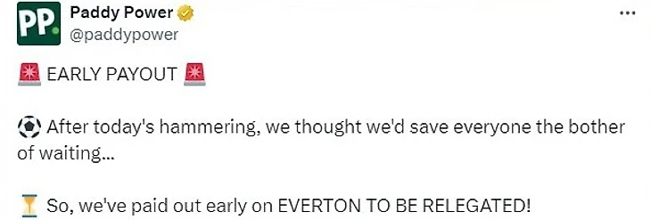 С «Эвертоном» вышло забавно: команда проиграла два первых матча в АПЛ с общим счетом 0:7 и опустилась на 20-е место в таблице, после чего Paddy объявили, что «все ясно, нет смысла тянуть дальше, выплачиваем всем, кто поставил на вылет».