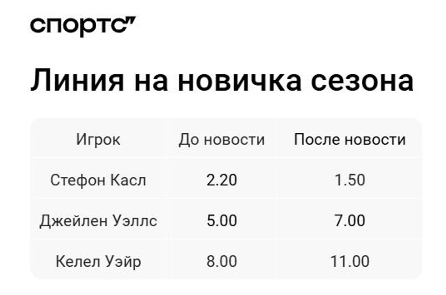 Теперь его шансы становятся еще выше. Расклад достаточно предсказуемый. В концовке сезона «Сан-Антонио» не будет бороться за победы, а Касл сможет сосредоточиться на личной статистике. Коэффициент на защитника после новостей о Вембаньяме рухнул с 2.20 до 1.50.