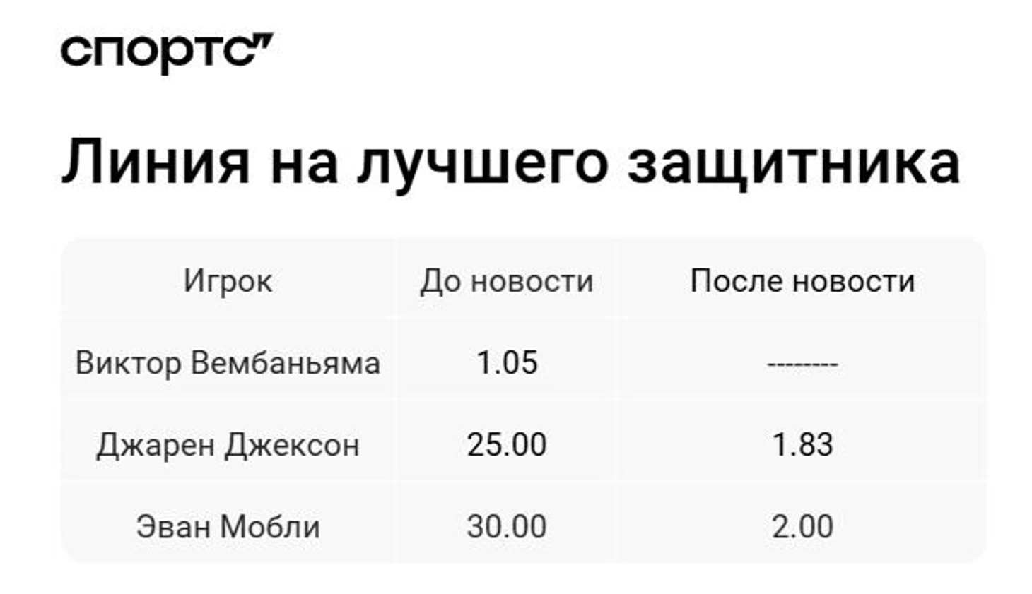 Интересно, что букмекеры почти никак не изменили коэффициенты на победу «Сан-Антонио». Вероятность и так не пересекала отметку в два процента, сейчас дают около 60.00 на итоговый титул. В общем, с Вембаньямой или без, шансов в этом сезоне все равно бы не было.
