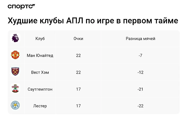 После перерыва у команды дела гораздо лучше – десятое место. За весь чемпионат «МЮ» выиграл три первых тайма и девять вторых.