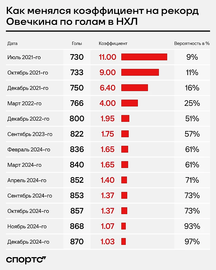 ● К концу года коэффициент упал до 1.85 (вероятность 54%), когда Овечкин достиг 870 голов. В начале января колебалось между 1.85 и 1.90.