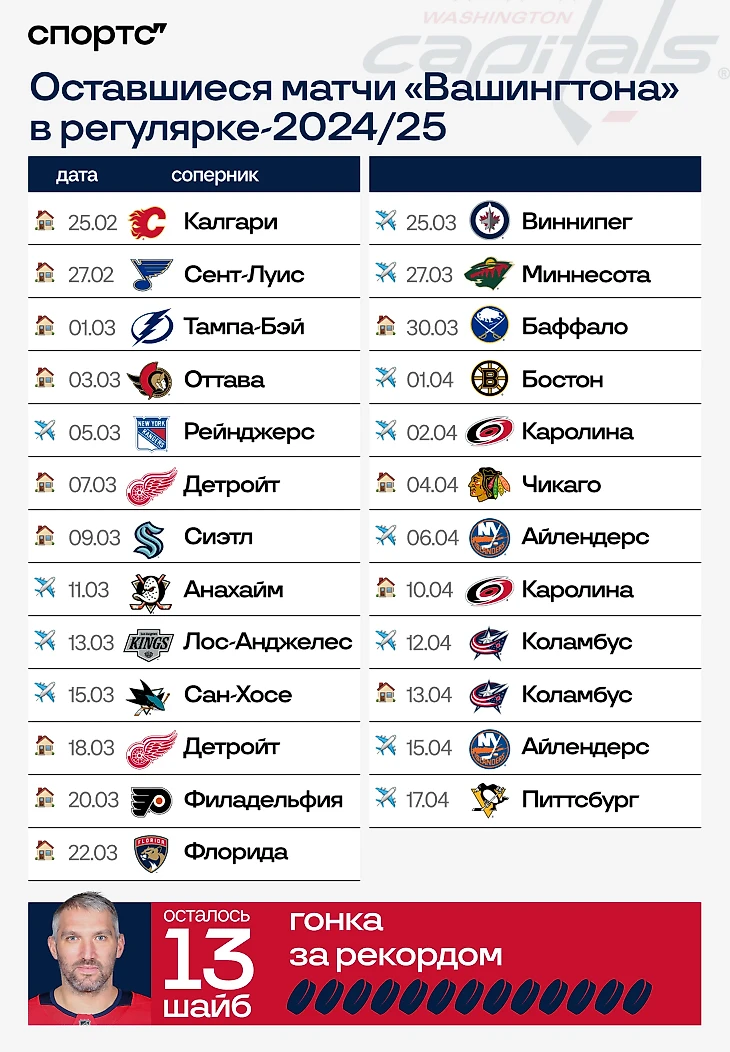 Спортс” фиксирует тут все, что касается будущего рекорда Овечкина. Сейчас у россиянина 29 голов в 41 матче сезона. С таким графиком достижения можно ждать уже в начале апреля. А вот с кем осталось играть «Вашингтону» в регулярке.