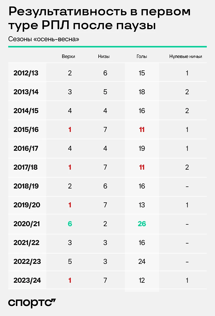 Выборка такая: только сезоны «осень-весна» – с 2012/13, только самый первый тур после зимней паузы, а в нем – количество верховых (не менее трех голов) и низовых (менее трех голов) матчей, а также общее число голов и нулевые ничьи.