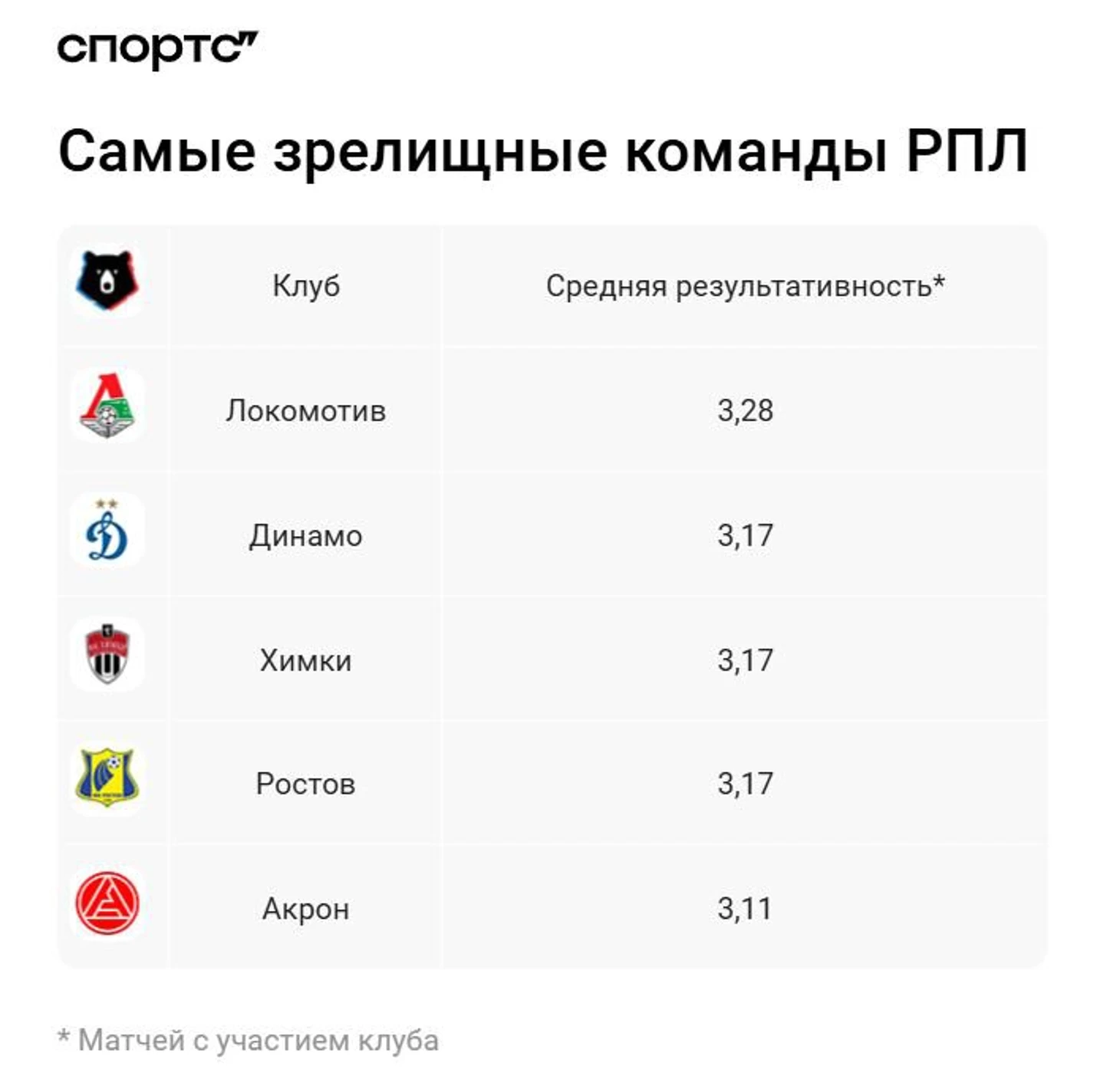 Сами железнодорожники забили 33 мяча – это всего лишь пятый показатель в чемпионате. Помимо «Локомотива», средняя результативность выше трех голов только у «Ростова», «Динамо», «Химок» и «Акрона», а вот «Спартак» чуть не дотянул, но идет верной дорогой (2,8).