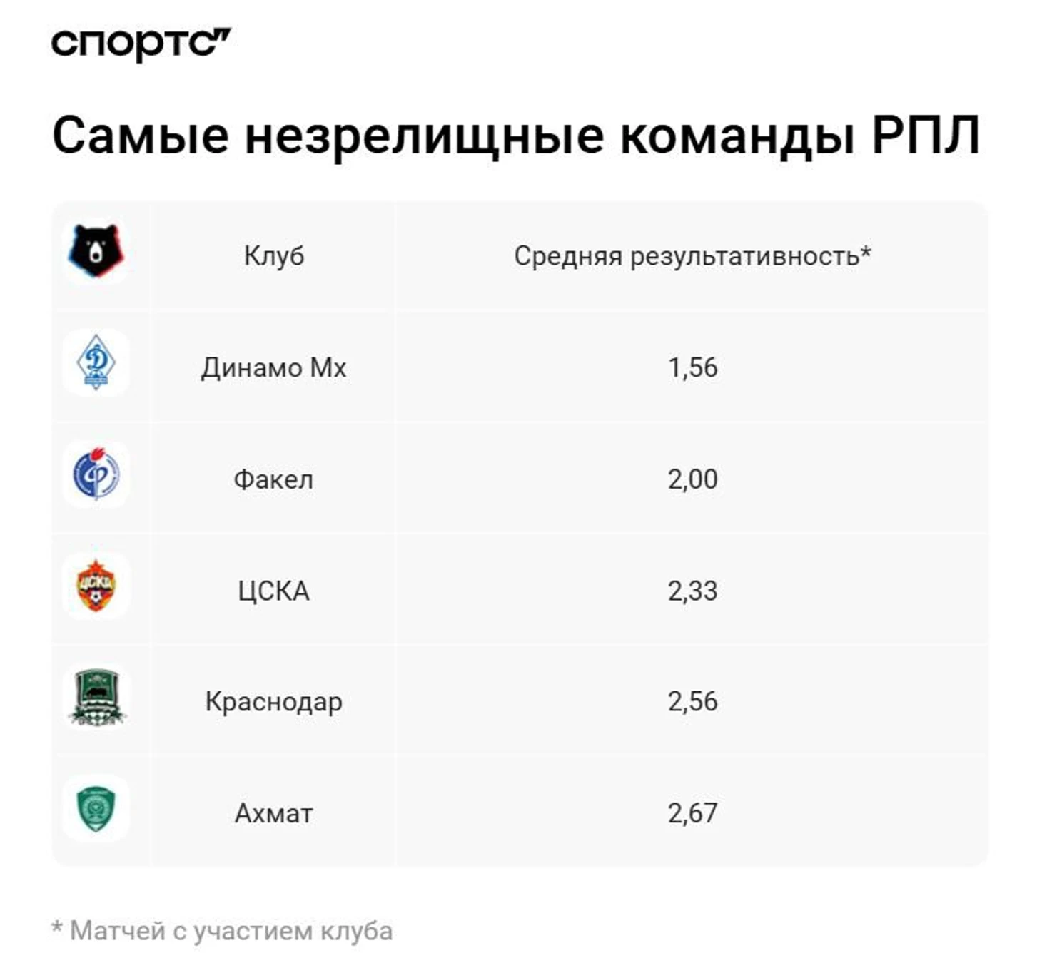 Махачкалинское «Динамо» и «Факел» сильно выделяются на фоне остальных. Команды забили всего по 11 голов в 19 матчах. Самое скучное зрелище РПЛ по статистике – игры в Воронеже. «Факел» дома пока оформил разницу мячей 4:6 и еще ни разу не пробивал тотал больше. А еще Воронеж – лидер по нулевым ничьим (пять матчей).
