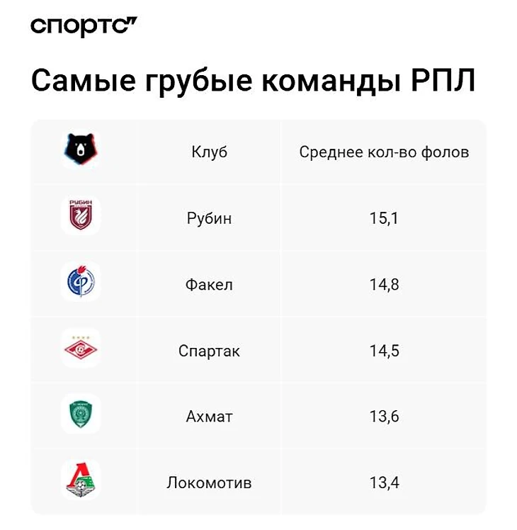Незаметный статистический прецедент – показатели «Спартака» по фолам. Очень редко клуб-лидер так много нарушает правила. После 19-го тура в РПЛ чаще фолят только «Рубин» и «Факел». При этом у красно-белых есть все шансы возглавить и эту таблицу – отставание совсем небольшое. Интересен контраст с «Зенитом» – самой вежливой командой чемпионата (275 фолов против 166).