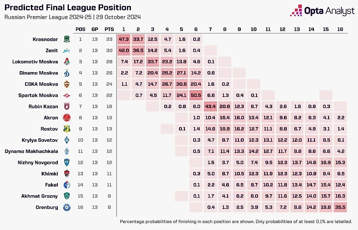 Не лишним будет еще раз вспомнить, где был «Спартак» у аналитиков и букмекеров до старта победной серии. Возвращаемся в тревожный для красно-белых октябрь: меньше 1% на титул от суперкомпьютера Opta и коэффициент 30.00 от букмекеров. Тогда «Спартак» не стеснялись ставить шестым (!) в чемпионской гонке. Почти не было шансов даже на бронзовые медали.