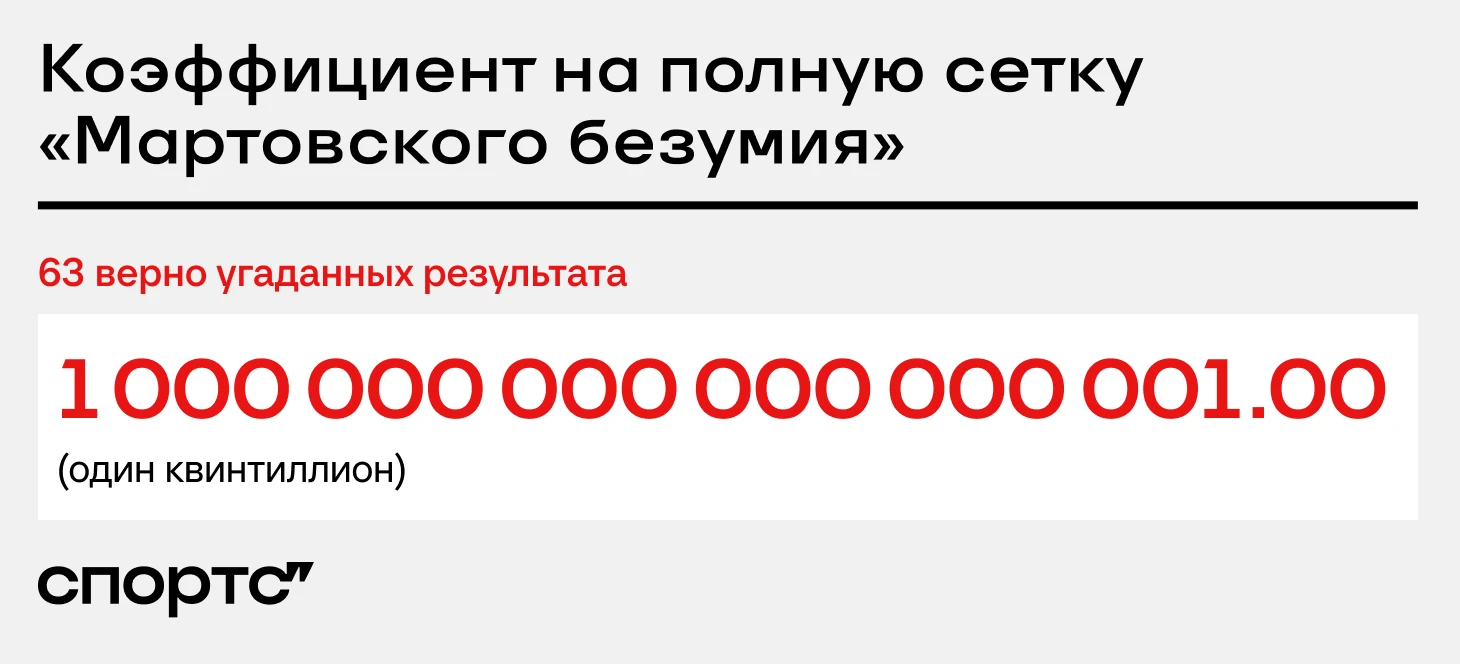 1 000 000 000 000 000 001 – кэф на всю угаданную сетку «Мартовского безумия». 1 к 9 квинтиллионам 🤯